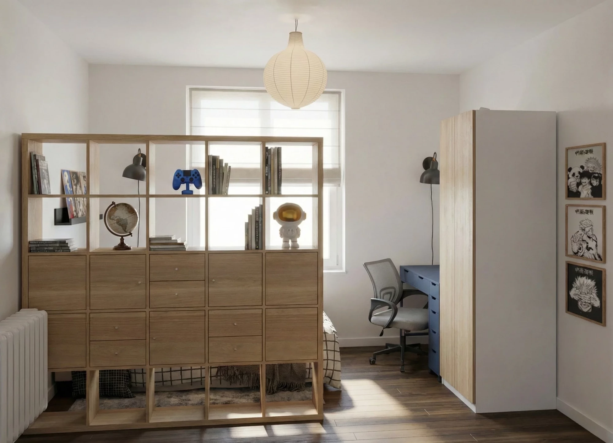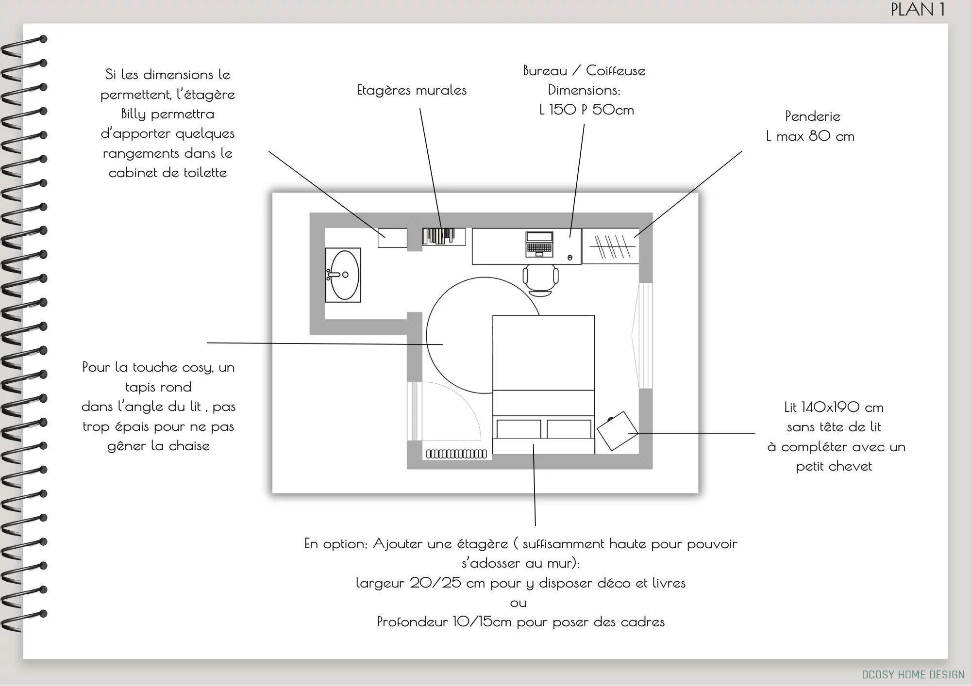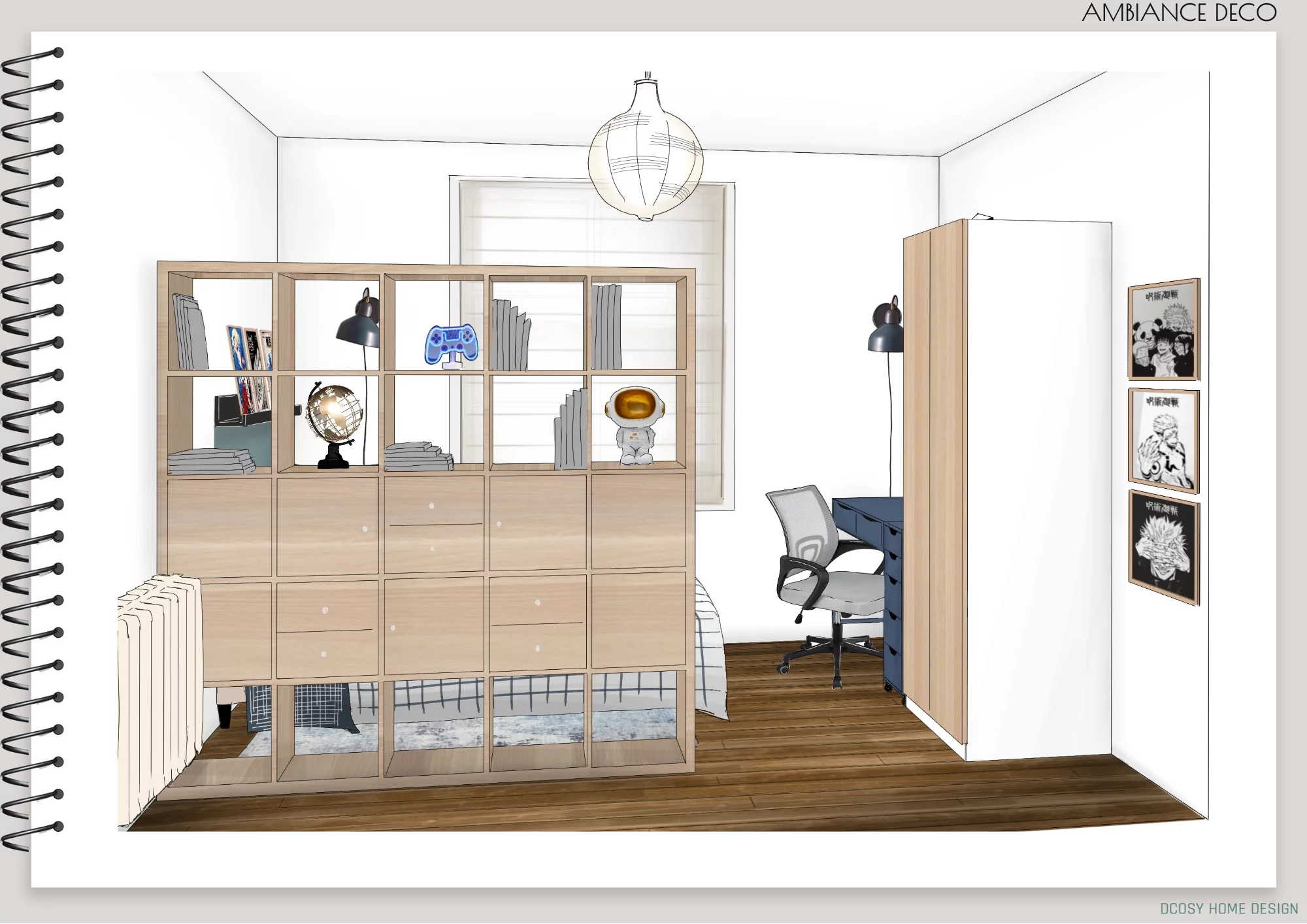 Mon client, locataire m’a demandé d’optimiser l’agencement la chambre de son fils. La plus grosse contrainte résidait dans le fait que cette pièce dispose du seul accès à a la salle de bain de l’appartement.  J’ai donc proposé une solution, sans travaux, pour garantir au jeune homme un minimum d’intimité .