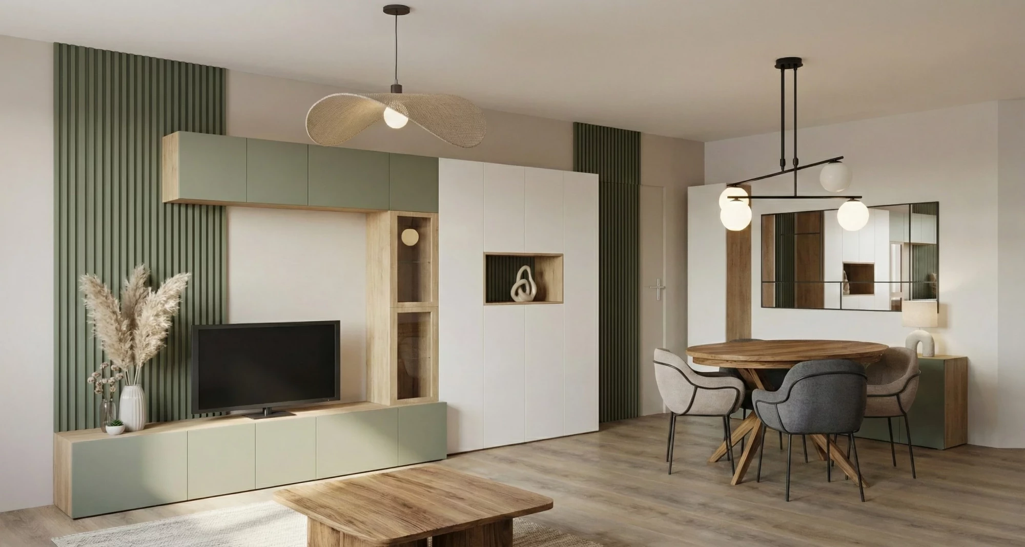 Mon client, locataire,  m’a demandé de repenser l’agencement et la décoration de cette pièce. L’enjeu était d’optimiser l’usage du canapé convertible qu’il utilisait au quotidien (les chambres étant réservées pour ses enfants), et de réfléchir à un espace de télétravail. Mon travail d’analyse et d’optimisation lui a permis d’avoir un vrai espace nuit avec un bureau, une partie séjour et un coin repas.