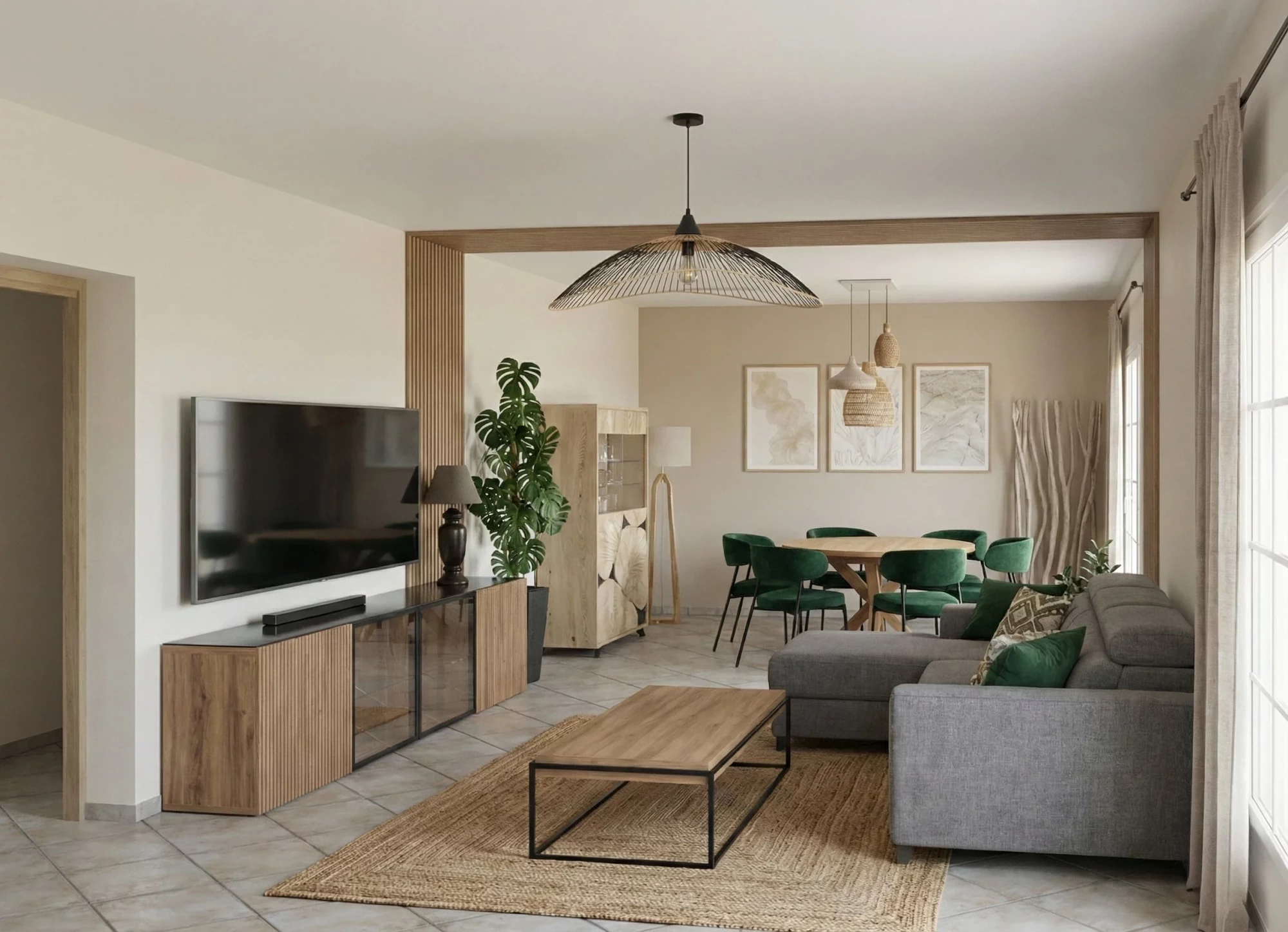 Ma cliente voulait atténuer sa déco , très marquée « style industriel » et voulait revenir à une ambiance plus douce et chaleureuse. Certains éléments de mobilier étaient à conserver : une console et le meuble télé notamment. Pour compléter, ma cliente souhaitait un canapé xxl et une table extensible entre autres. Elle a opté pour une formule croquis déco avec liste d’achats et une deuxième configuration de canapé.