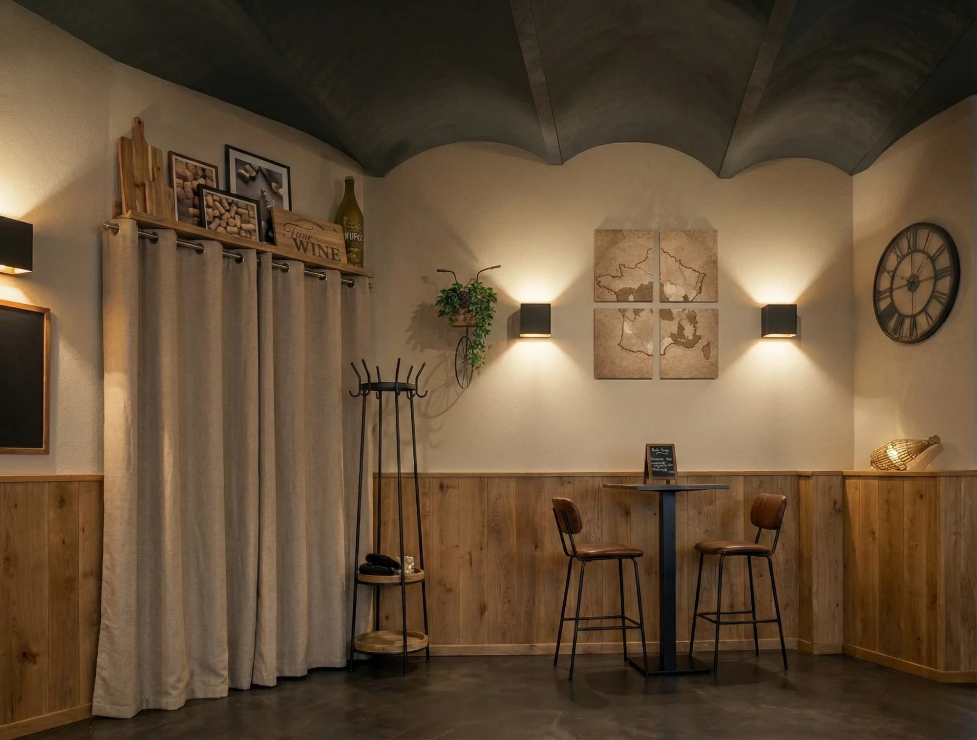 Mon client, caviste, m’a confié l’agencement et la décoration d’une salle de dégustation, attenante à sa boutique. Je devais  conserver son identité visuelle et l’ambiance de l’espace de vente. J’ai également aménagé et décoré un petit espace de préparation, ouvert sur la salle permettant à mon client de préparer des planches apéritives destinées à accompagner ses dégustations.